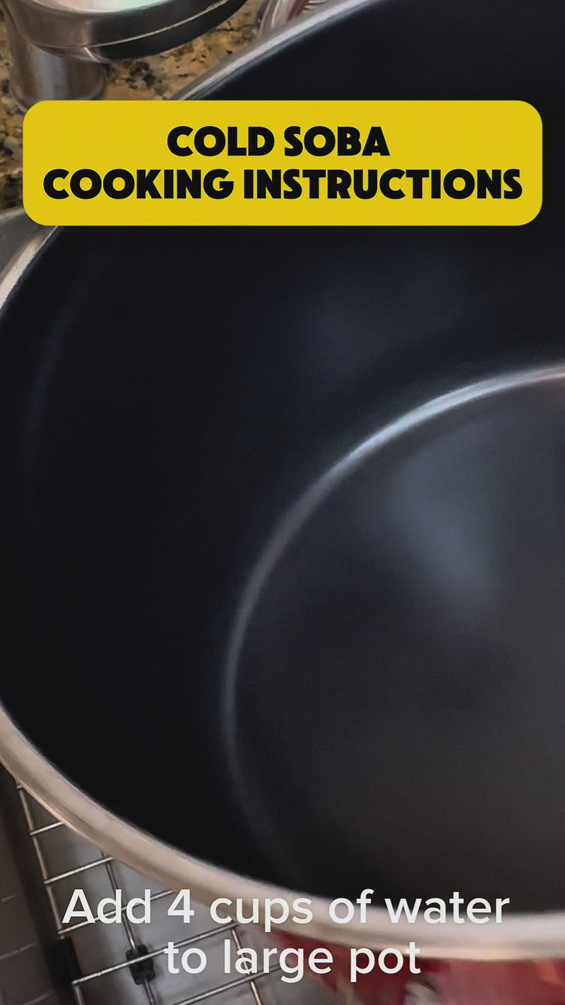 - Boil 4 cups of water in a pot. Cook 2 bundles of soba noodles for ~6 minutes. Stir occasionally to separate noodles.